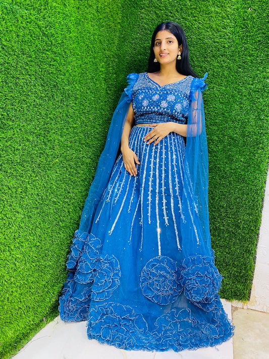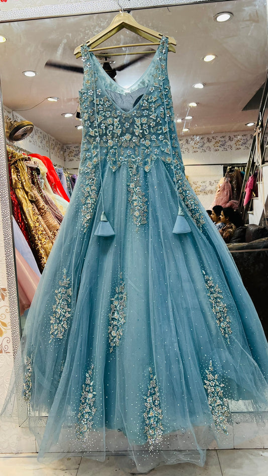 Ocean Luxe – Frill Gown in Peacock Blue with Beads & Stones