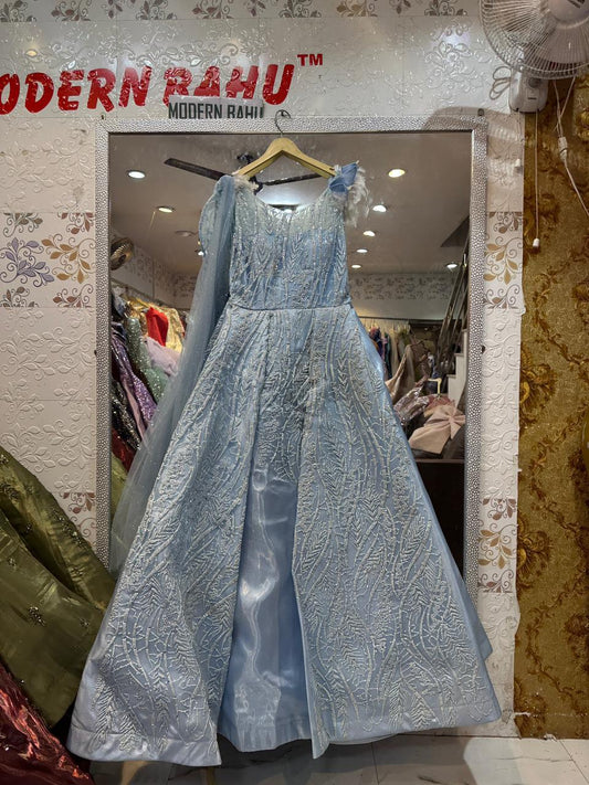 Icy Blue Feather-Shoulder Ball Gown – Silver Sequin Embroidered Evening Dress with Cape Drape