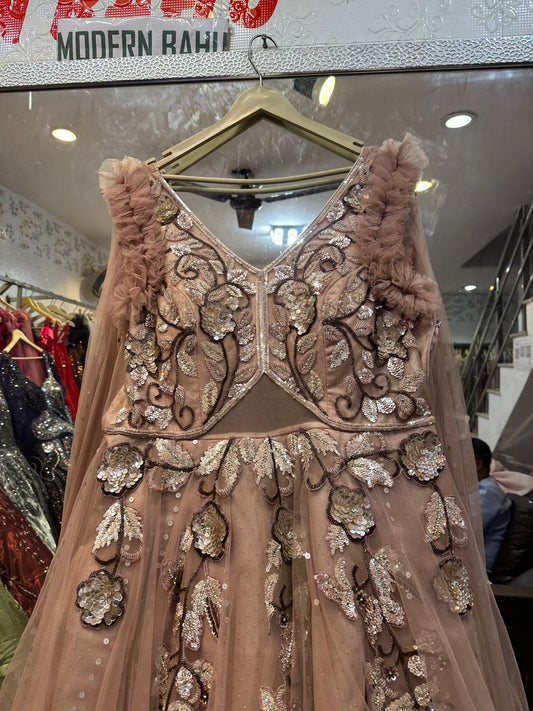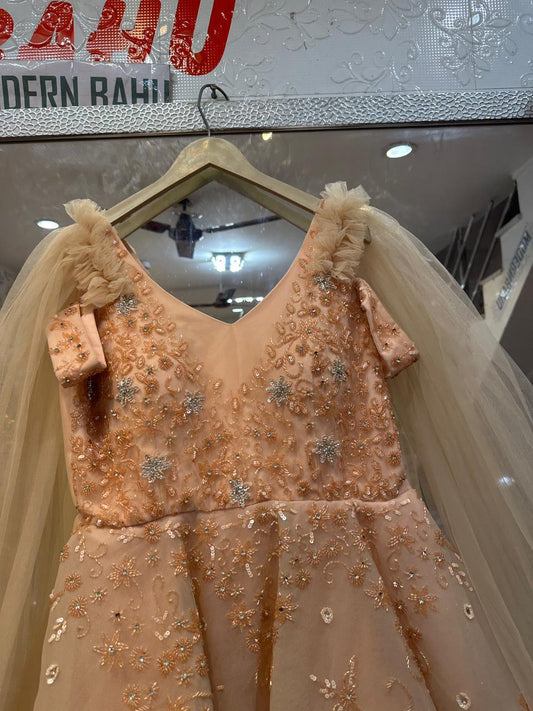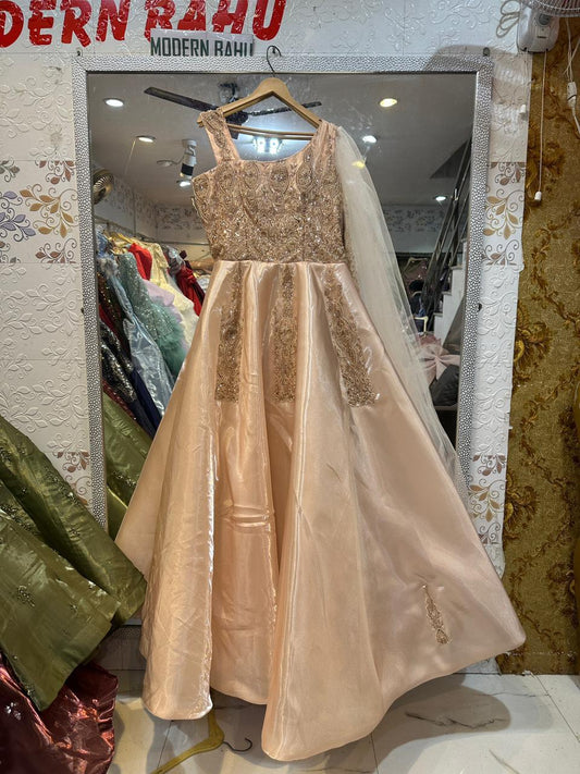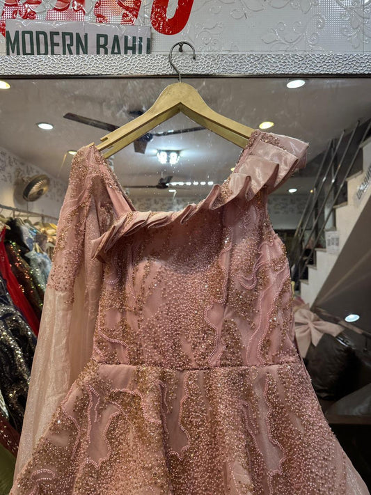Peach Champagne Satin Ball Gown – Heavy Stone Work Square Neck Party Dress with Sheer Cape