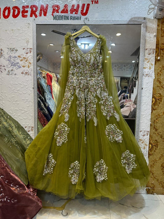 Olive Green Heavy Embroidered Cape Gown – Floral Sequin Net Party Dress with Floor-Length Drapes