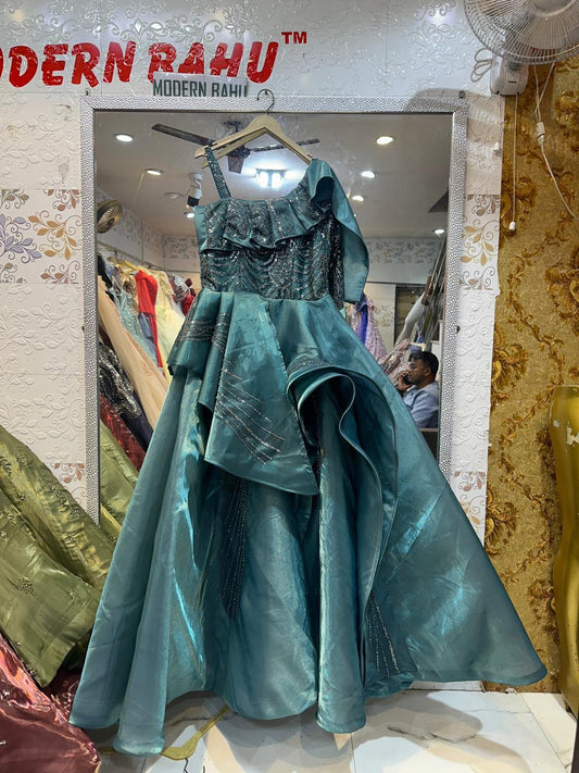 Teal Green One-Shoulder Ruffle Ball Gown – Sequin Embroidered Asymmetric Evening Dress