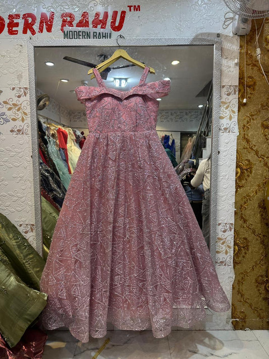 Dusty Pink Geometric Glitter Ball Gown – Cold Shoulder Party Dress with Abstract Triangle Sequin Work