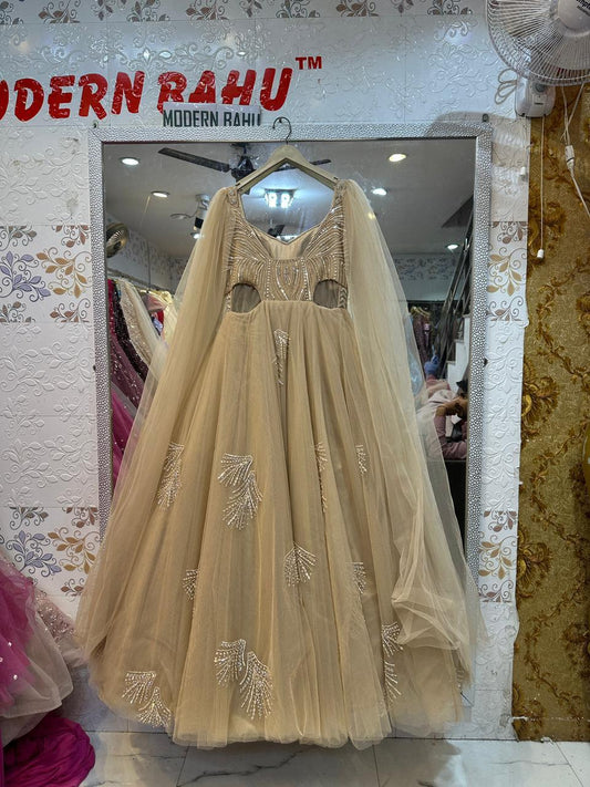 Ethereal Champagne Gold Gown with Floor-Length Cape Sleeves & Waist Cut-Outs – Reception & Cocktail Wear