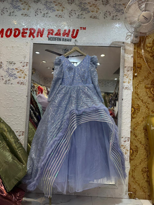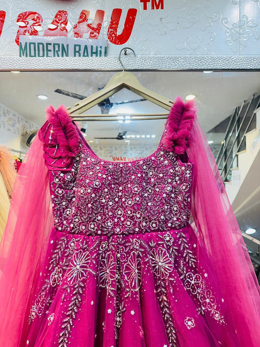 Vibrant Fuchsia Pink Net Gown with Ruffled Shoulders & Crystal Floral Embroidery – Party & Sangeet Wear
