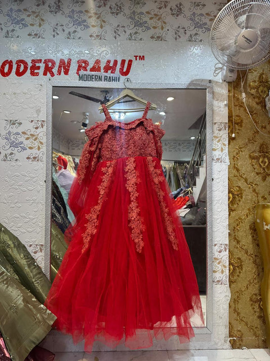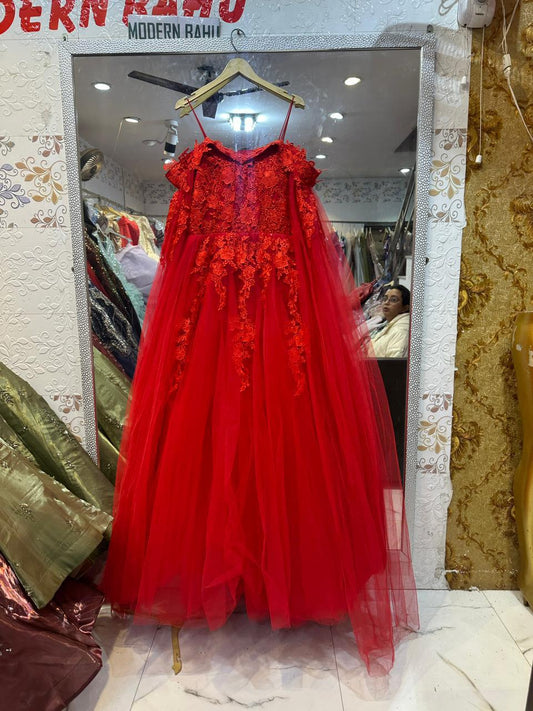 Luxury Red Cold-Shoulder Net Ball Gown with Floral Lace Embroidery - Designer Party Wear