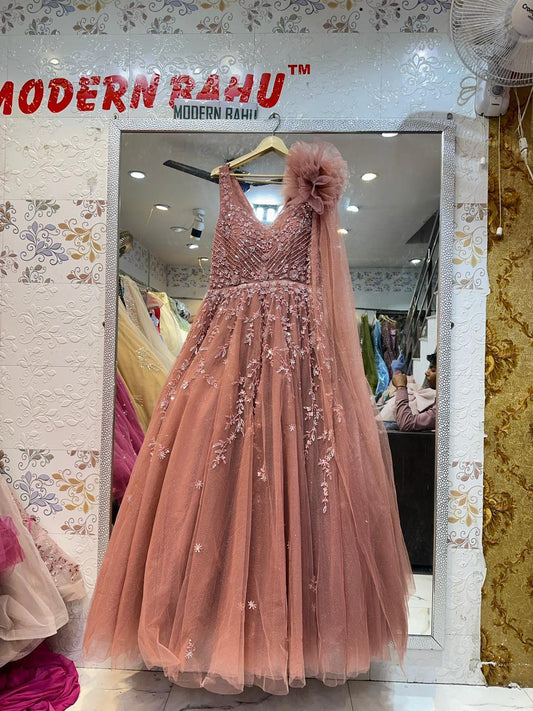 Dreamy Dusty Pink Gown with Statement 3D Flower & Attached Drape – Engagement & Reception Wear