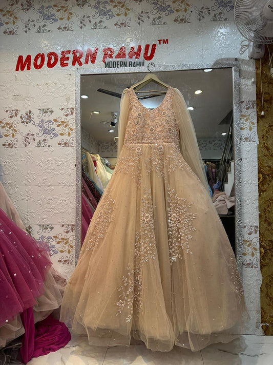 Elegant Peach Net Gown with Floral Sequin Embroidery & Floor-Length Cape Sleeves – Engagement & Party Wear