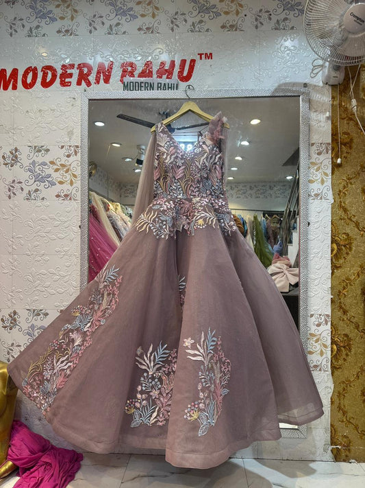Fairytale Dusty Mauve Ball Gown with Multi-Color Floral Embroidery & Feather Shoulder Detail – Reception Wear