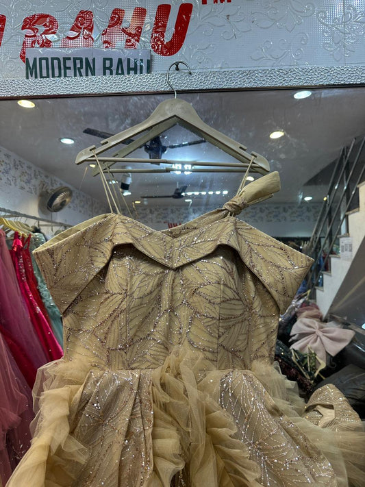 Sparkling Champagne Gold Gown with Ruffled Peplum Waist & Shoulder Bow – Modern Prom & Cocktail Wear