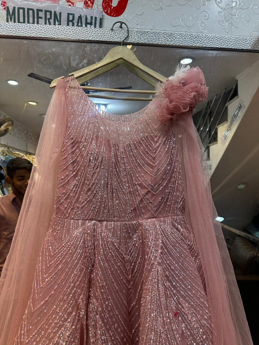 Radiant Dusty Pink Shimmer Gown with Cape Sleeves & 3D Shoulder Flower – Cocktail & Reception Wear