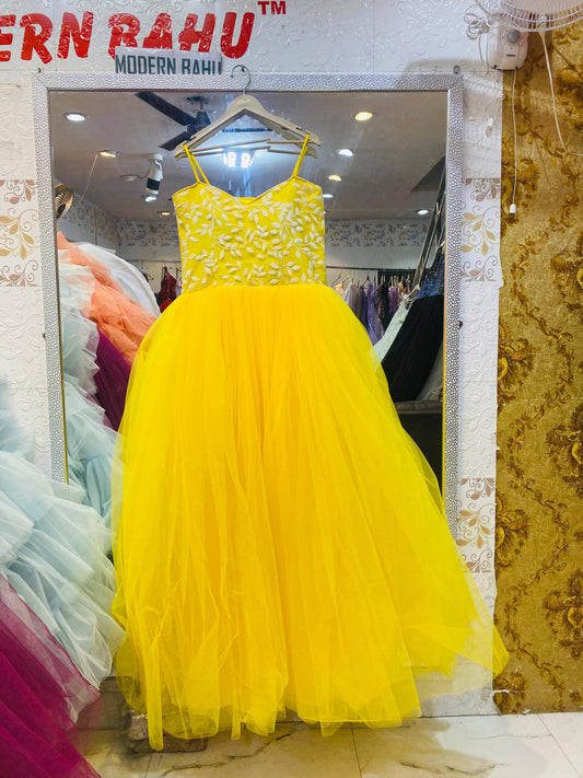 Radiant Yellow Tulle Gown with White Leaf Embroidery – Spaghetti Strap Haldi & Party Wear