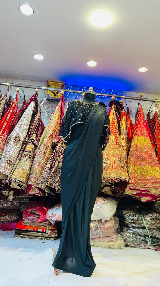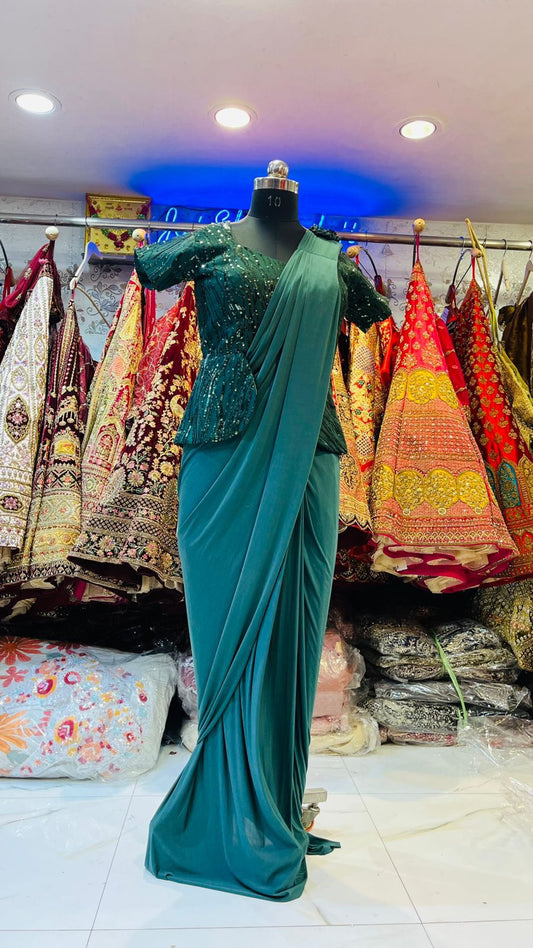 Teal Green Ready-to-Wear Saree Gown – Sequin Peplum Blouse with Pre-Draped Pallu & Shoulder Flower