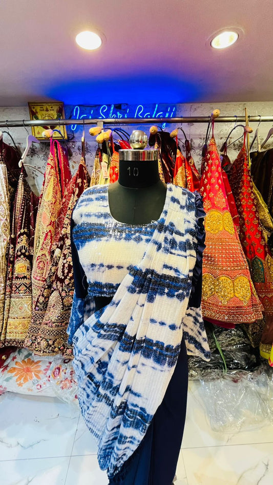Navy Blue & White Tie-Dye Ready-to-Wear Saree – Sequin Shibori Print Party Gown with Ruffled Hem