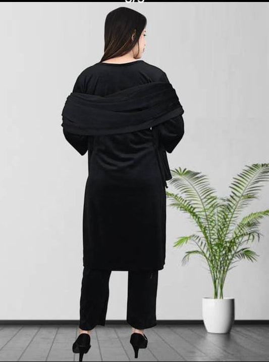 Winter Party Wear - Classic Black Velvet Finish Kurta Pant Set with Geometric Stone Work & Dupatta