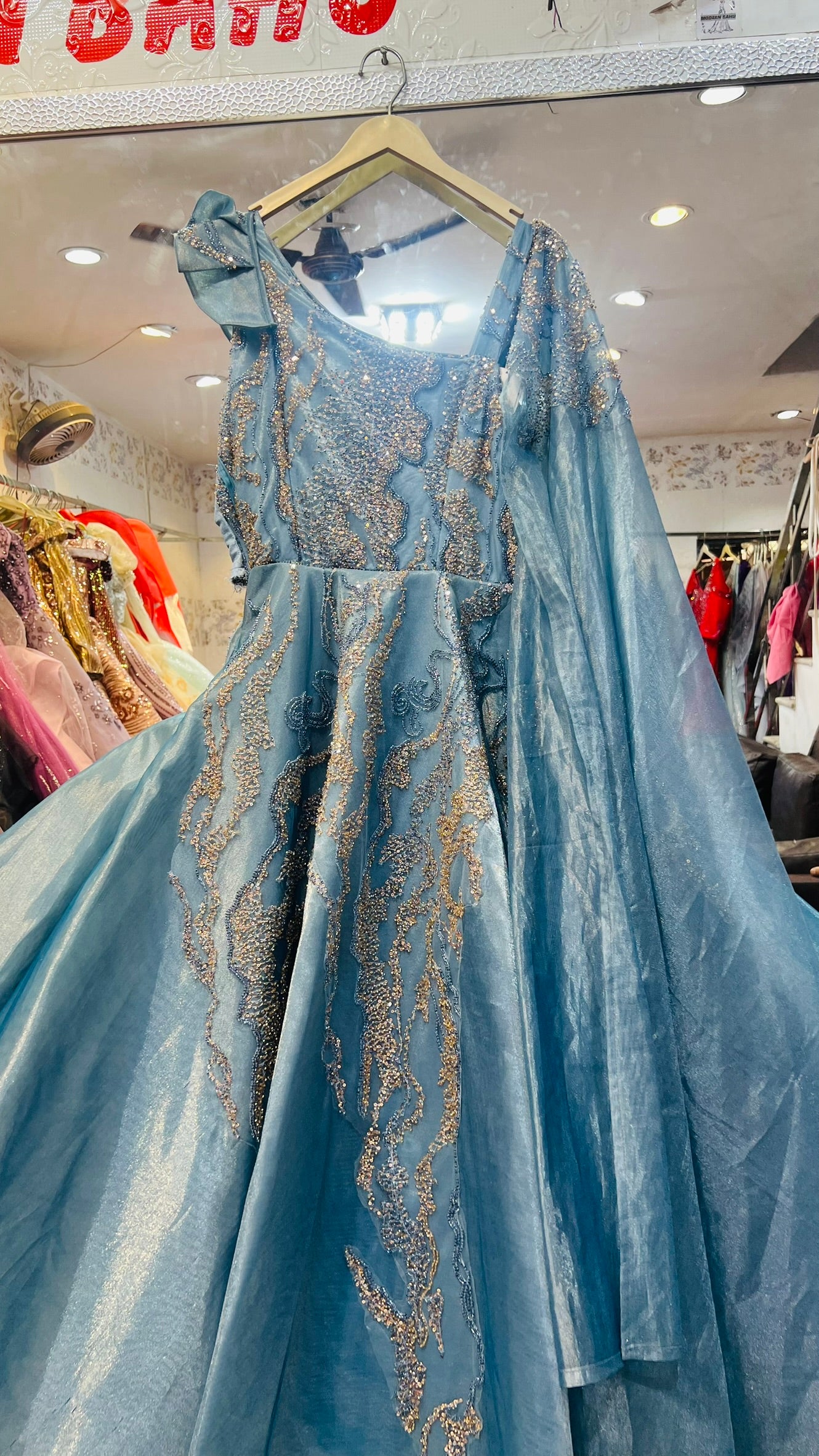 powder blue gown, handwork gown, gown with patch work, party wear gown, reception gown for women, pastel color gown, elegant gown for wedding, designer gown online, blue gown for evening party, embroidered gown dress, long gown for women, bridesmaid gown india, ethnic gown dress, modern gown designs, indian wedding gown