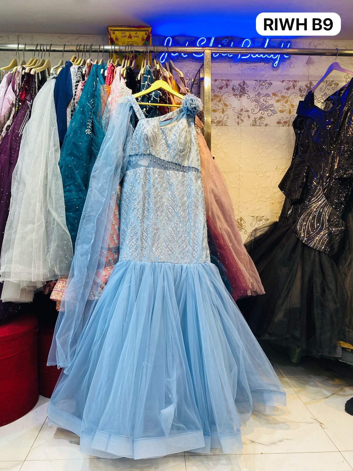Fishcut Gown for Engagement, Zarkan Gown India, Designer Party Gowns Delhi, Sheer Waist Gown, Bridal Gown for Reception, Imported Fabric Gown, Modern Bahu Dresses, Chandni Chowk Designer Dresses, Engagement Outfit for Bride, Mermaid Gown Online India, Custom Gown with Net Flair, Luxury Gowns with Handwork