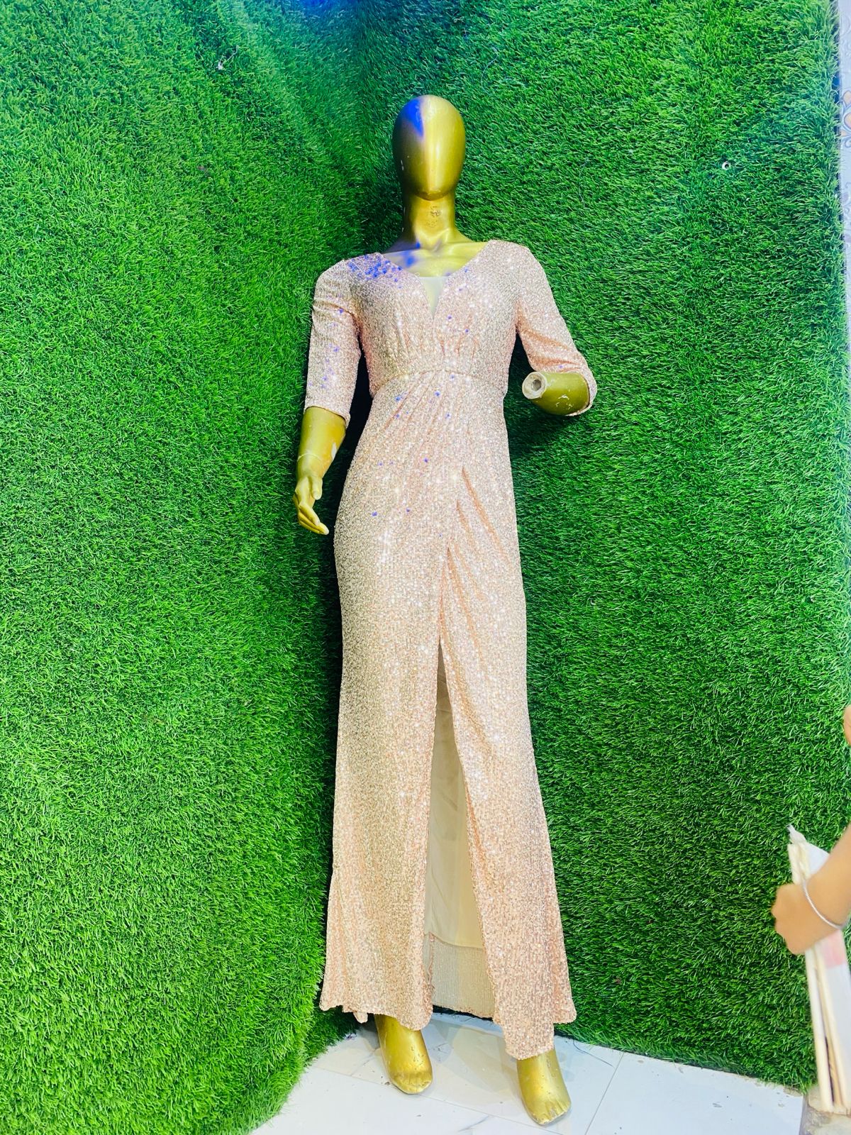 A sequin golden slit dress is all about glamour, boldness, and spotlight moments — perfect for parties, New Year's Eve, or cocktail nights