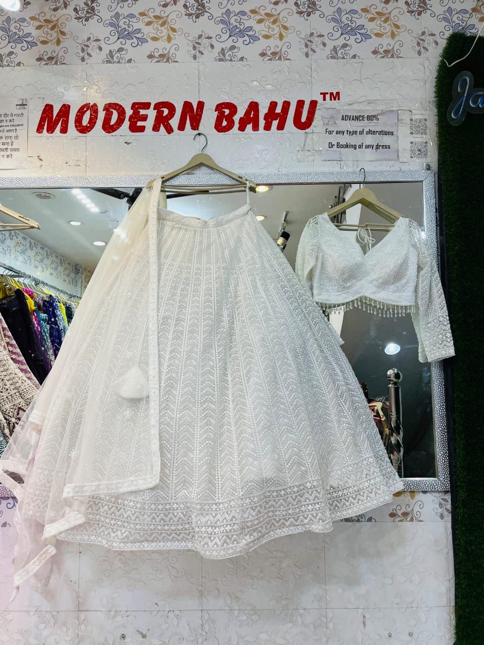 Embody grace and sophistication in this pristine ivory white lehenga choli. The ensemble features a designer blouse with sheer full sleeves, a V-neckline, and a trendy pearl-beaded tassel hem that adds a playful movement. The flared skirt is intricately crafted with heavy tone-on-tone thread embroidery in a mix of chevron (zigzag) and vertical geometric patterns, giving it a luxurious Chikankari-inspired look. Paired with a matching net dupatta, this monochromatic masterpiece is ideal for Nikah ceremonies, receptions, and day weddings.