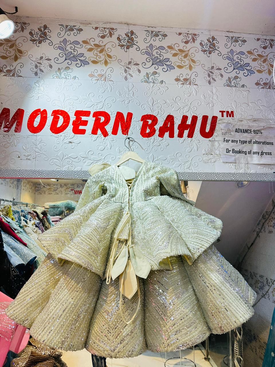 - Fabric: Heavily embellished sequin fabric with structural volume.