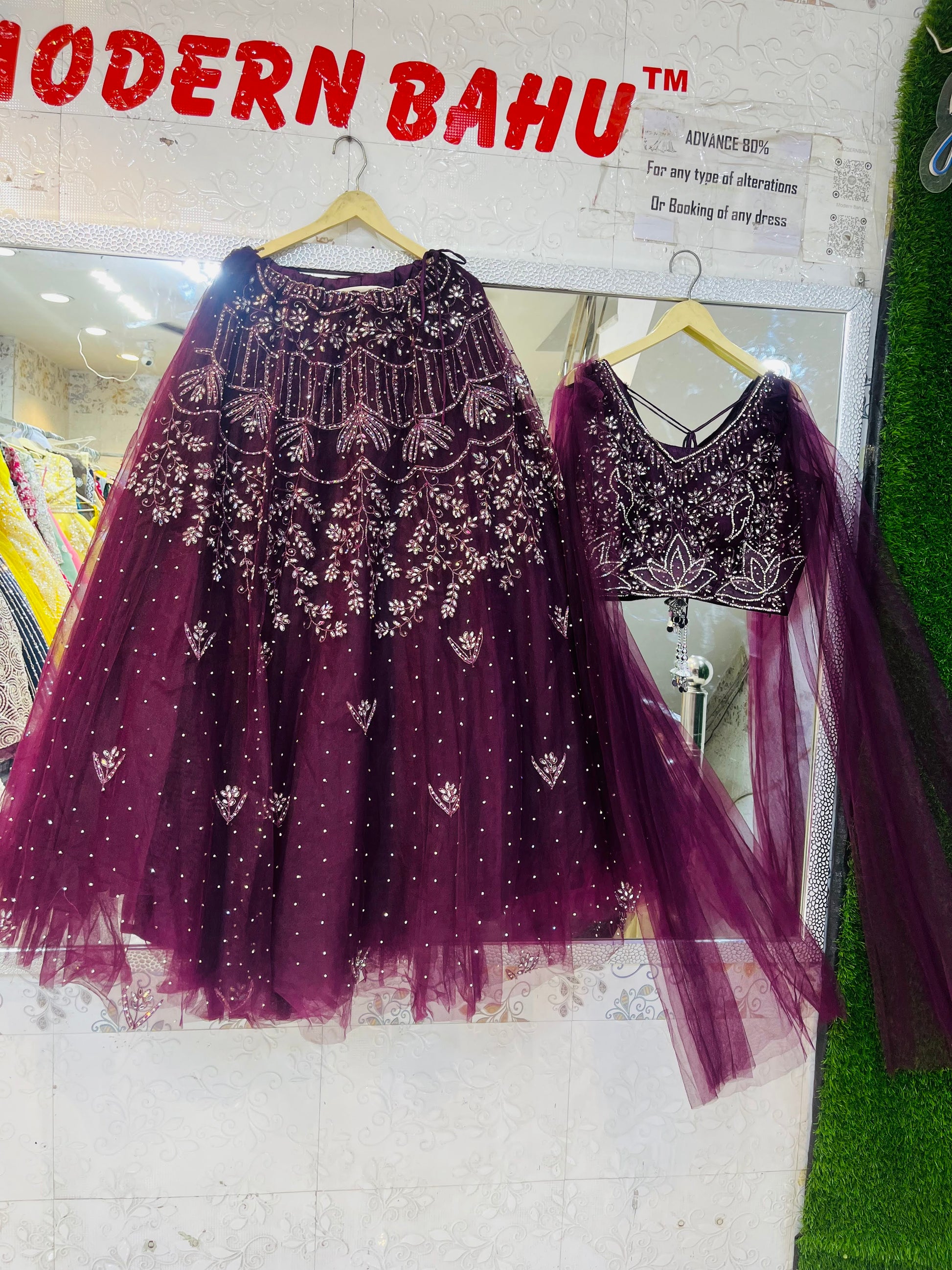 Wine Color Crop Top Lehenga with Heavy Handwork & Printed Design
